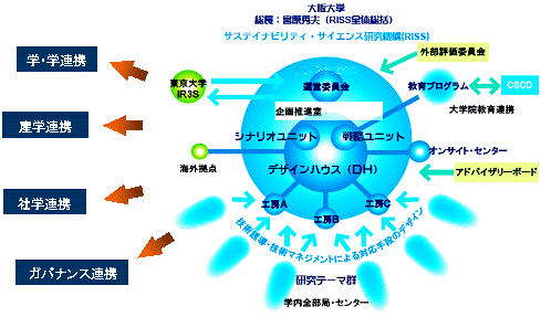 RISSデザインハウス RISSデザインハウスは、全学的な協力のもと、環境・資源・エネルギー分野に関連した経済、社会システム、環境システムの専門家、産業界の技術マネジメント担当者、大阪大学内の各科学技術分野の研究者の集合体として構成しています。主として持続可能な未来社会の予測と技術開発課題の設定と設定された科学技術に焦点を絞って研究開発のマネジメントを行うことで、サステイナビリティの学理に基づく、問題解決型の研究開発、技術マネジメントを推進しています。 |